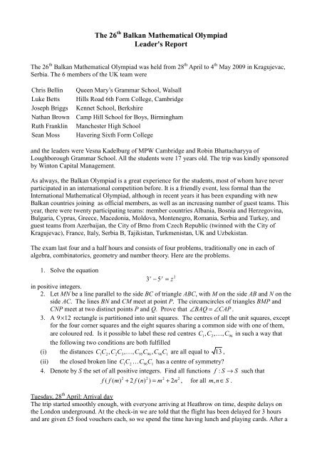 The 26 Balkan Mathematical Olympiad Leader S Uk Imo Register