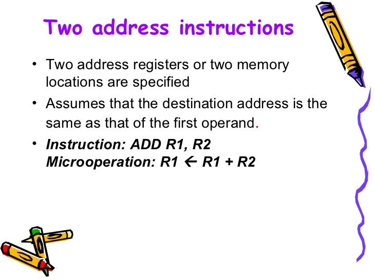 One address field is used for destination and two. For stack machines the terms 0-operand and zero-address apply to arithmetic instructions but not to all instructions as 1-operand push and pop instructions are used to access memory. Example of 1 address instruction.